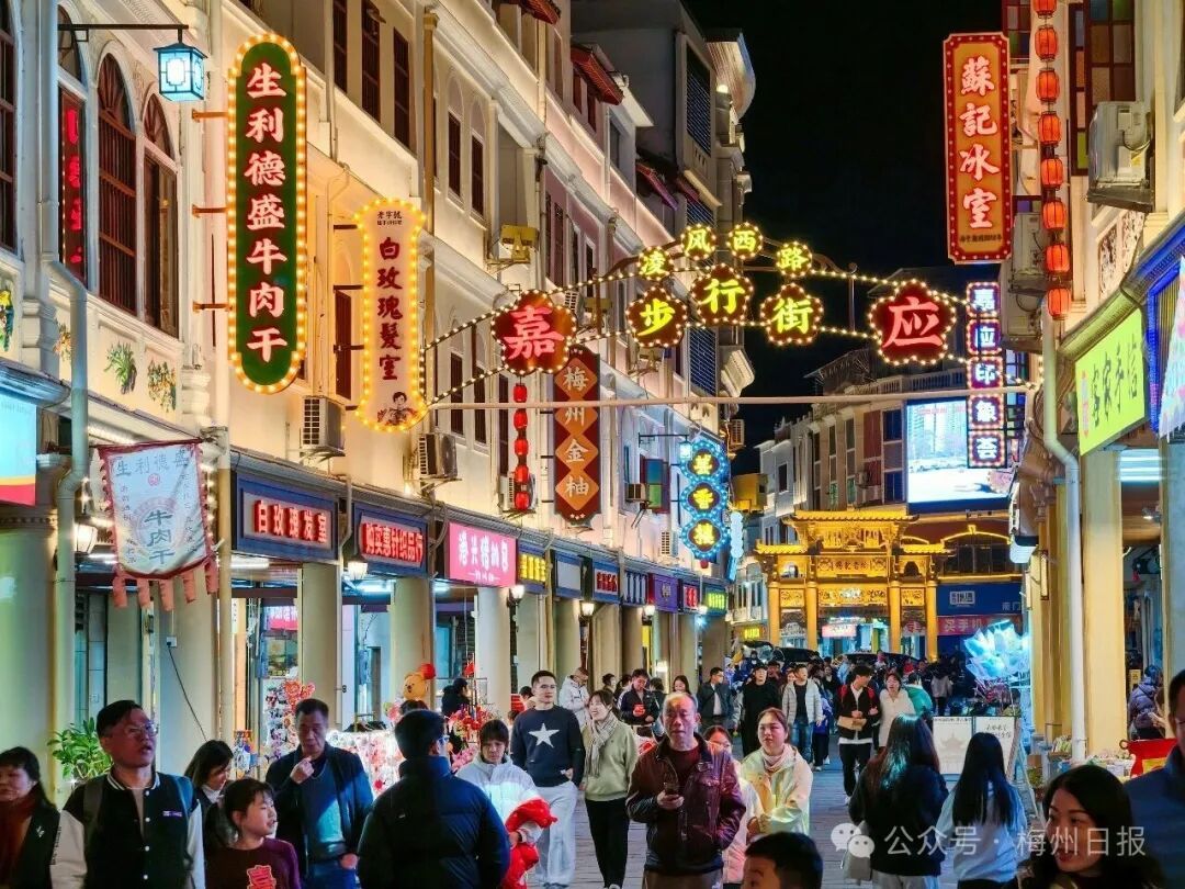 夜幕下的嘉应古城,灯火璀璨,暖意融融。踏着青石板路,穿梭于骑楼古巷,沉浸式感受浓厚的客家文化。